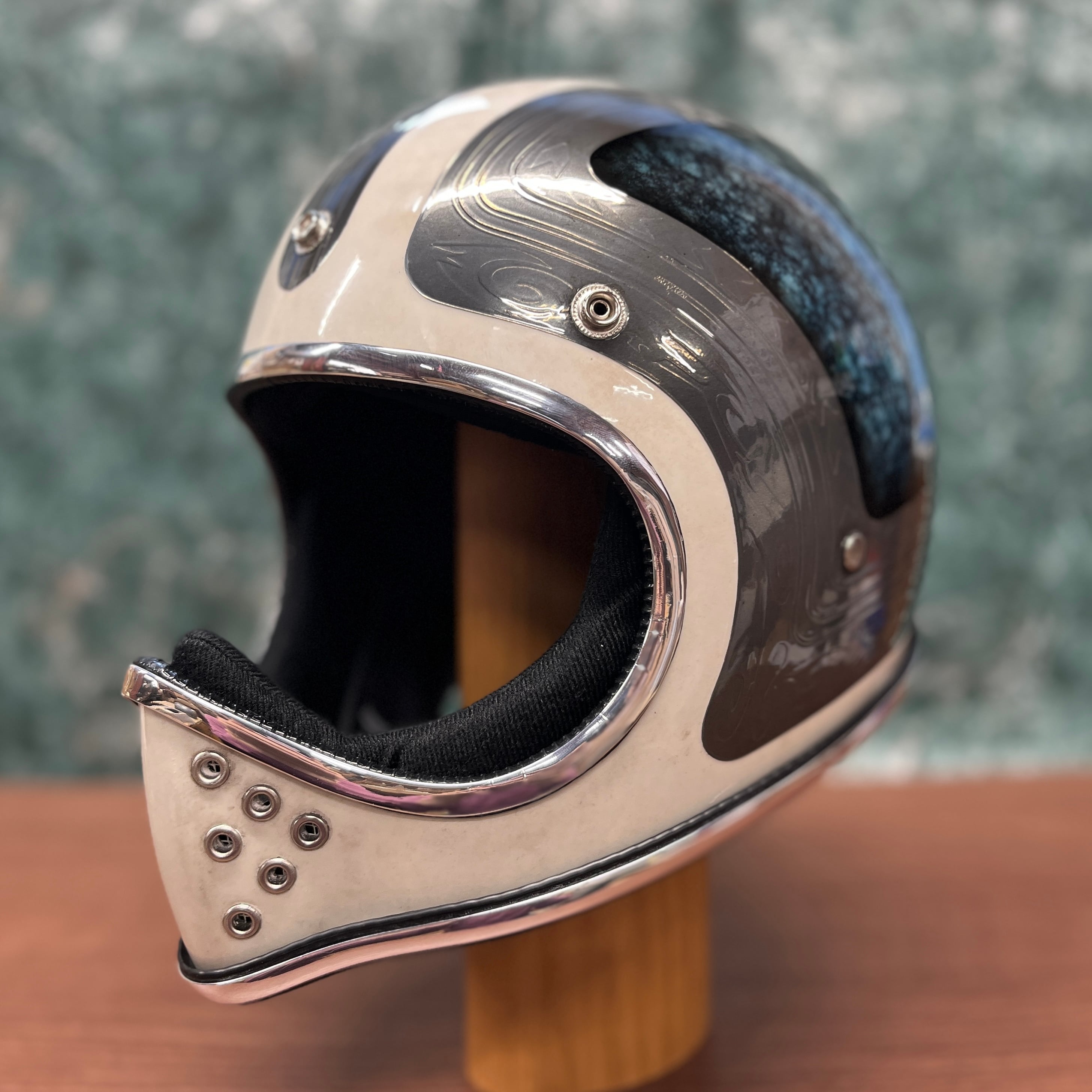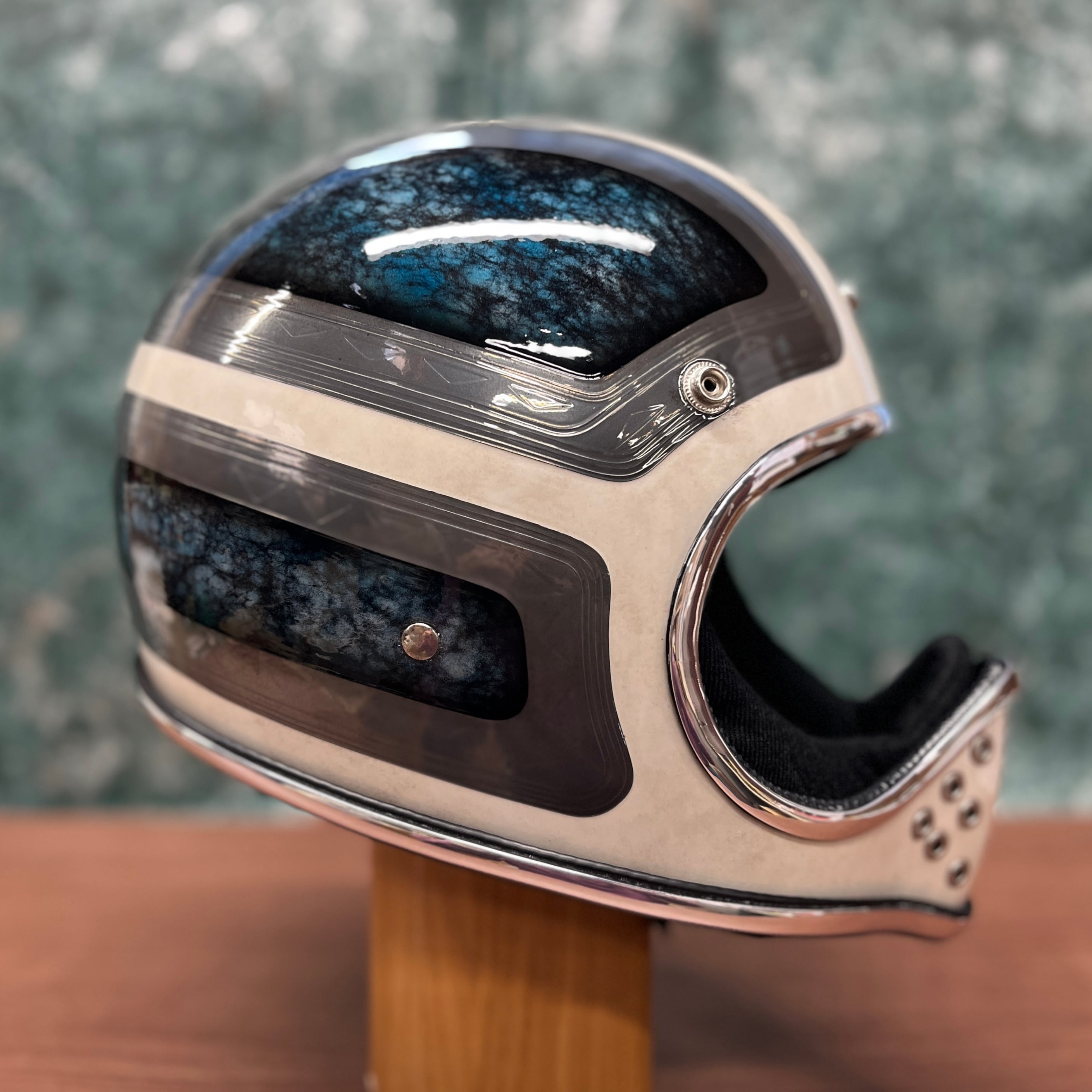 本作はメンズジュエリーからインスピレーションを受け、“身に着ける装飾品”としてのヘルメットを追求して制作しました。メインとなるブルーのパートには、ターコイズの天然石を思わせる質感を塗装で再現。単なる色ではなく、奥行き・濁り・ムラ感まで計算し、光の当たり方によって表情が変化する立体的な仕上がりになっています。